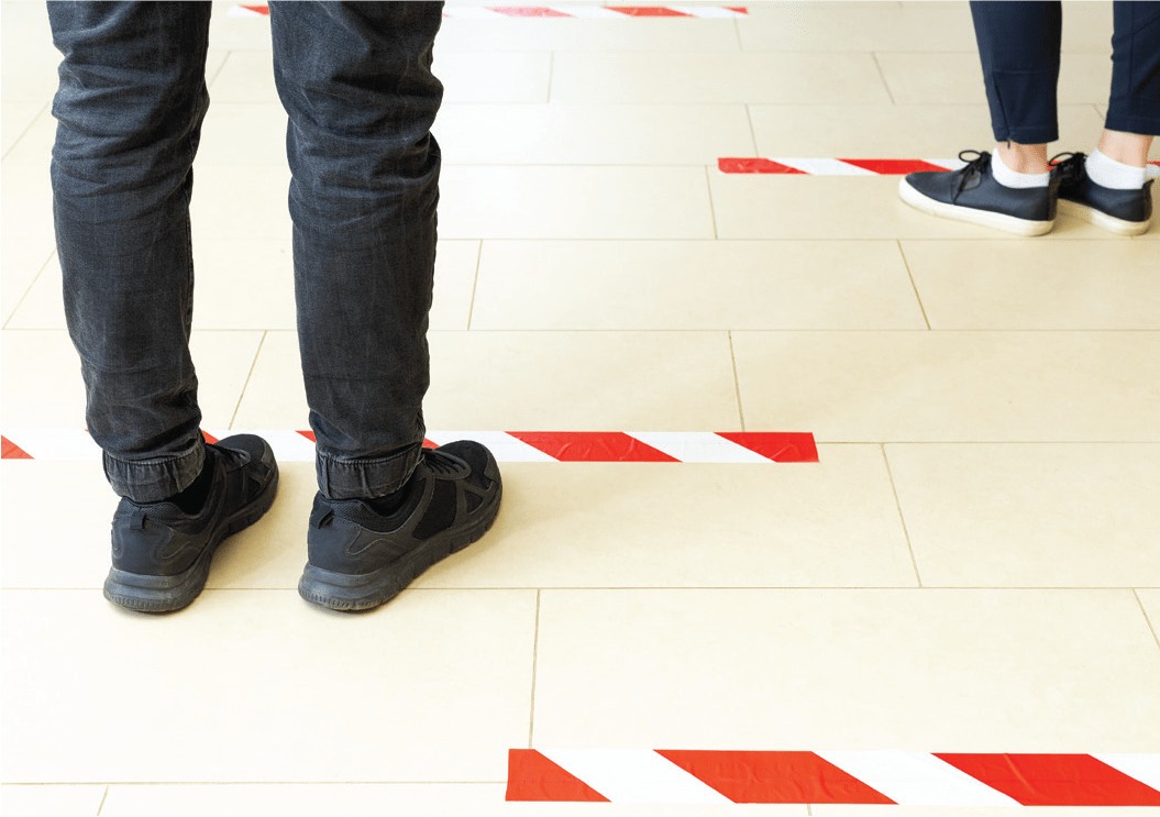 Walk this way: Waiting rooms and pathways had markings to indicate safe social distancing areas.